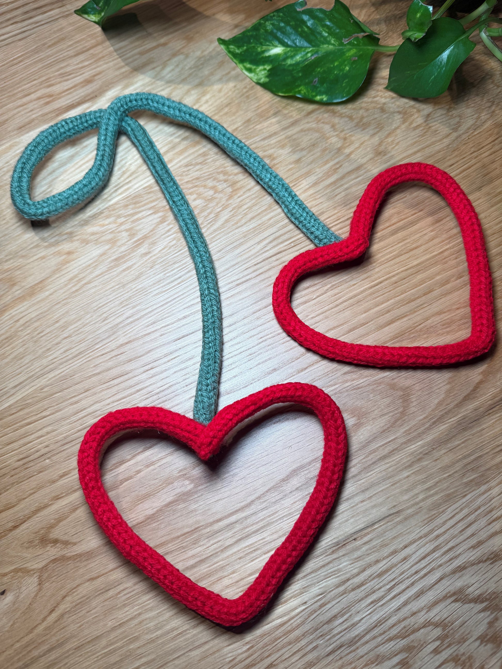 A delicate heart and cherry design, hand-shaped from wire and wrapped in soft yarn for a seamless, cozy finish. This item is lightweight and simple, perfect for adding a subtle handmade touch to your space.