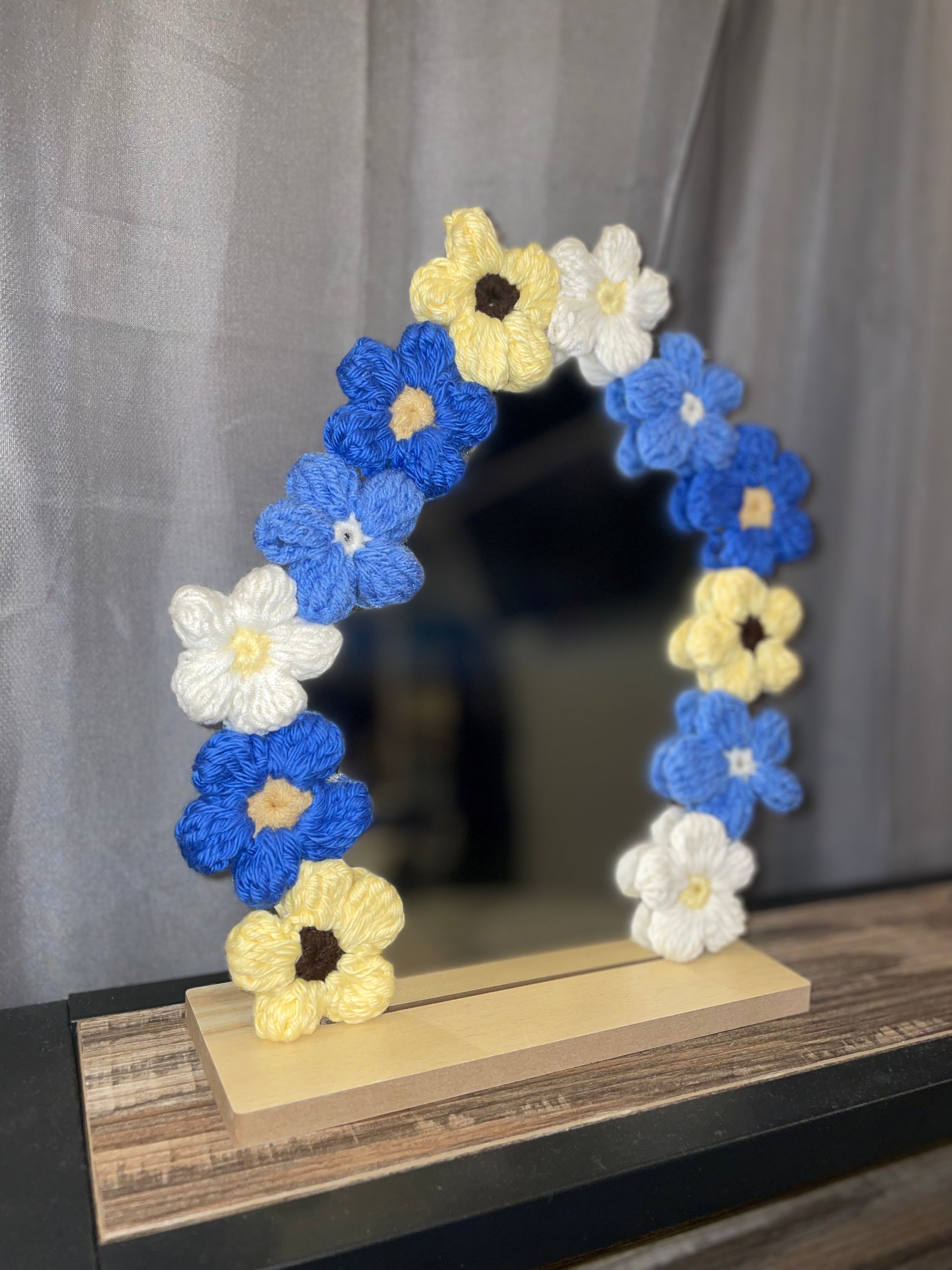 Each flower is hand-crocheted and securely attached around the mirror’s edge, creating a playful, floral frame that brings joy every time you check your reflection.